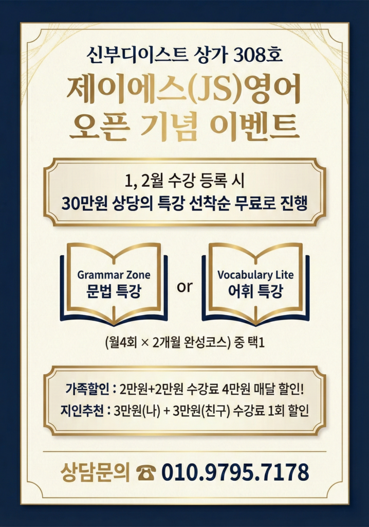 1, 2월 수강 등록 시 30만원 상당의 특강을 선착순 무료로 제공합니다. 무료특강은 Grammar Zone 문법 또는 Vocabulary Lite 어휘 특강 중 선택 가능합니다.